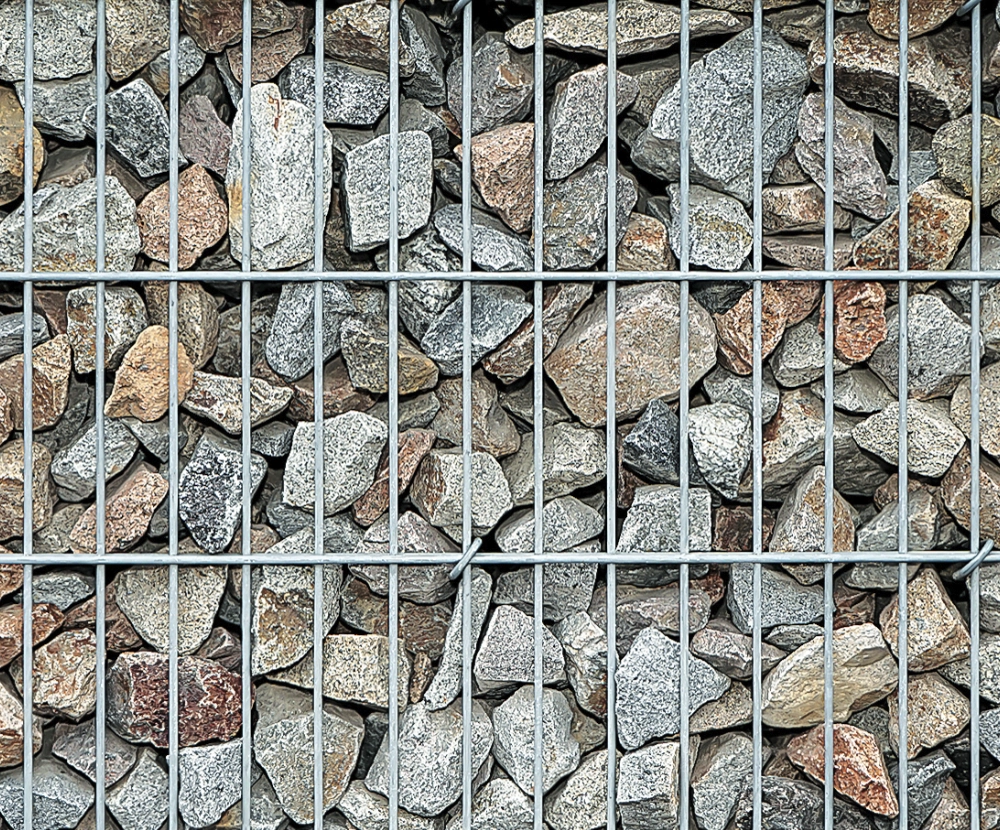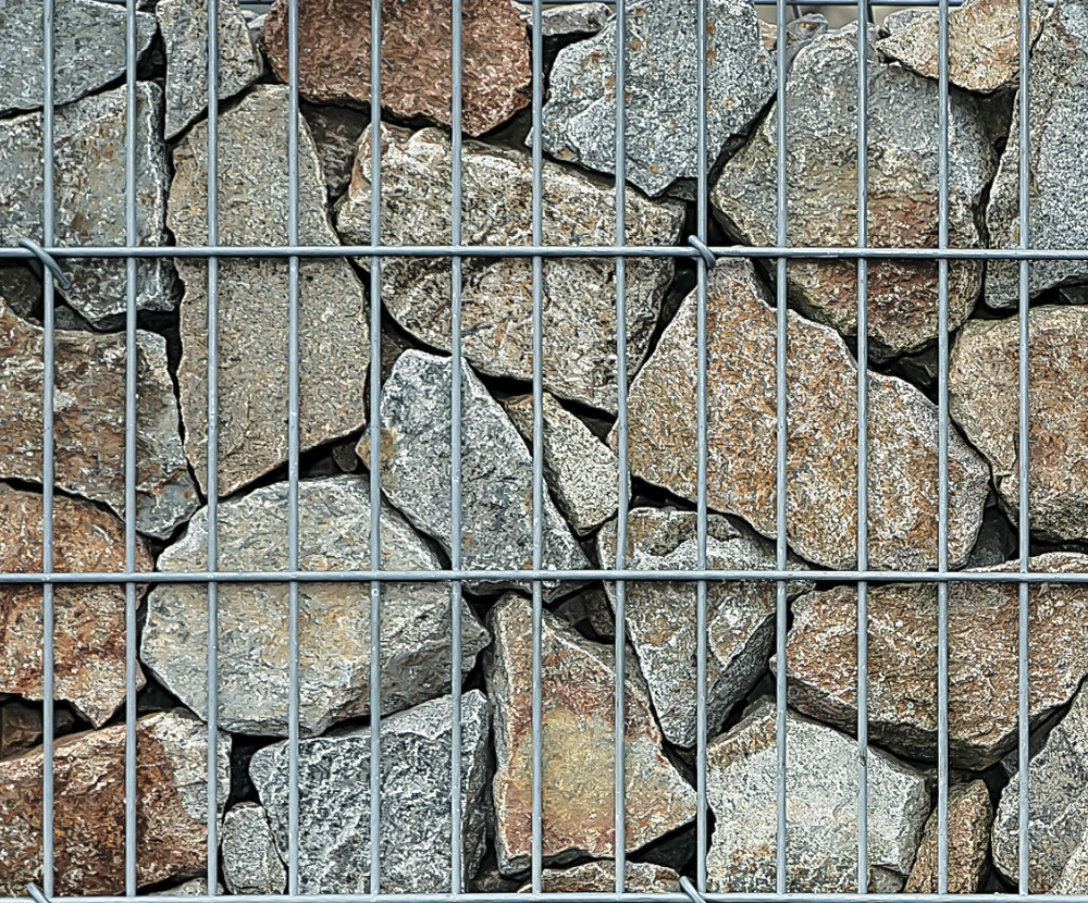 Das Skelett der transportablen Gabionen bilden hochwertige Stahlkörbe – made in Germany – bestehend aus kaltgezogenem Walzdraht S 235, Drahtdurchmesser 5,6 mm, elektrisch punktgeschweißt, Maschenweite 5 x 20 cm.