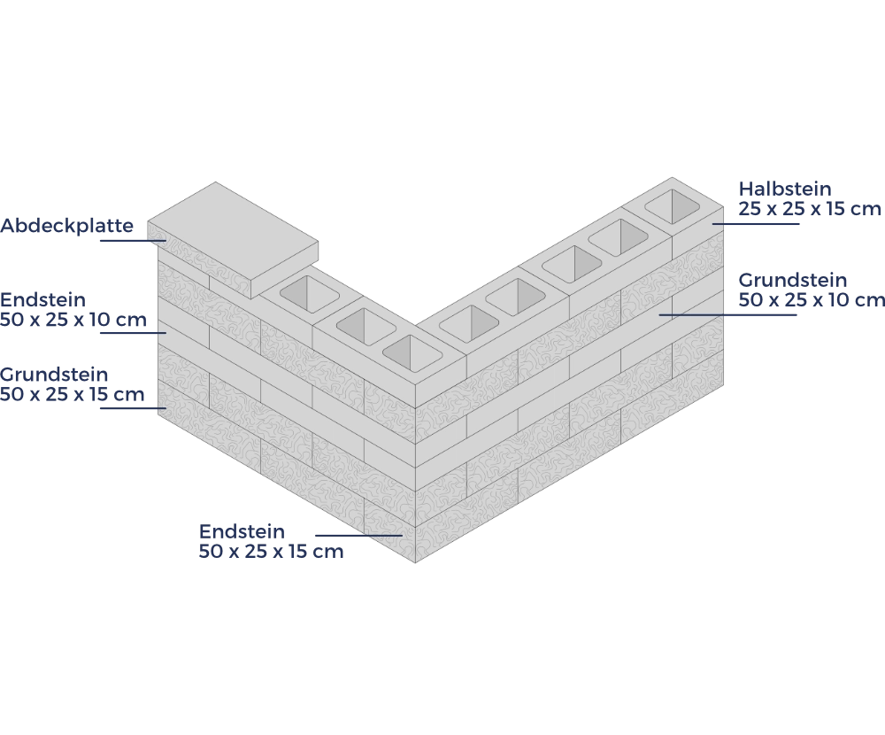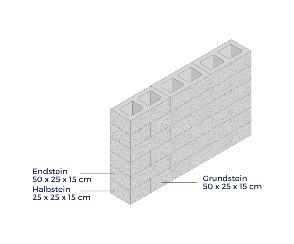 Die Mauersteine eignen sich für freistehende oder hinterfüllte Bauweisen. Ihre Hohlräume ermöglichen eine ökologische Begrünung. Alternativ kann die Mauer mit passenden Abdeckplatten ergänzt werden.